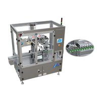 Wrap-around labelling systems for particularly slim products (test tubes etc.), processed horizontally on an idle roller conveyor. Available with automatic loader.
